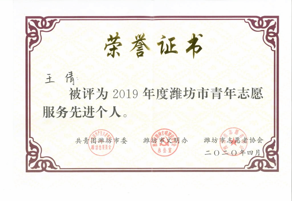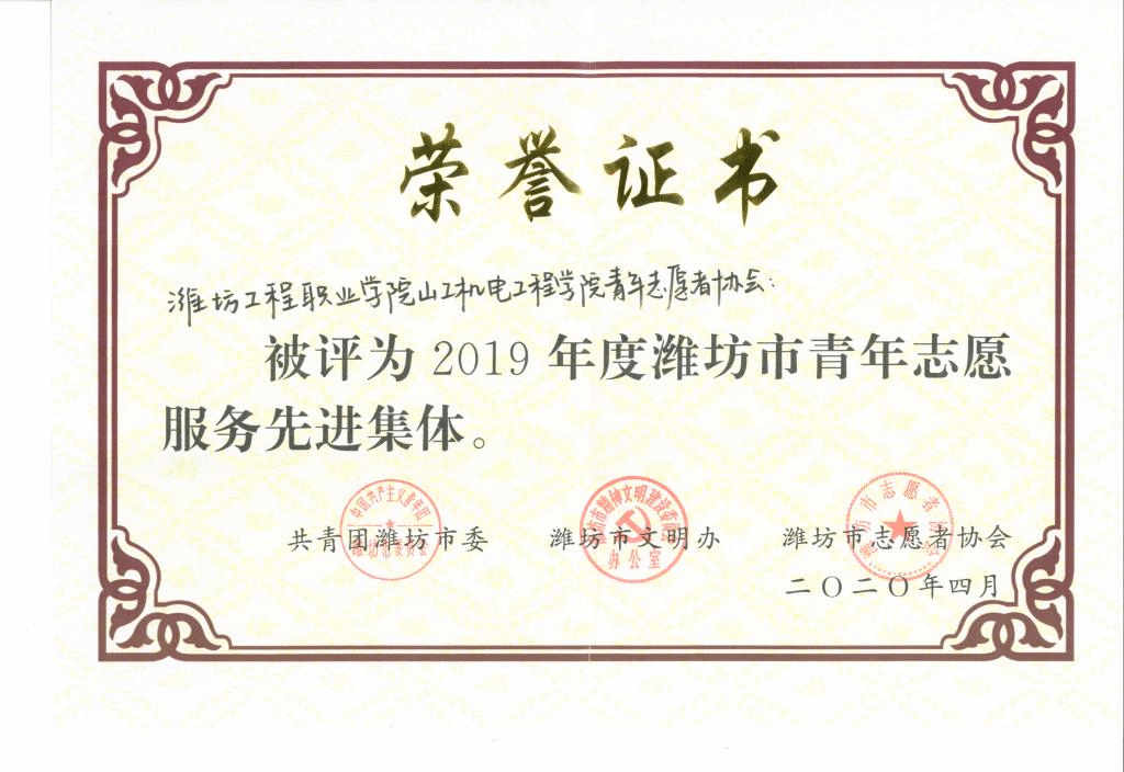 为进一步弘扬“奉献、友爱、互助、进步”的志愿精神,推动青年志愿服务工作实现更好发展,引导广大青年积极参与志愿服务事业,今年4月,共青团潍坊市委、潍坊市精神文明建设委员会办公室、潍坊市志愿者协会联合举办2019年度潍坊市青年志愿服务先进集体和先进个人评选。近日,评选结果揭晓。我院山工机电工程学院青年志愿者协会荣获“2019年度青年志愿服务先进集体”、王倩老师获“2019年度潍坊市青年志愿服务先进个人”荣誉称号。