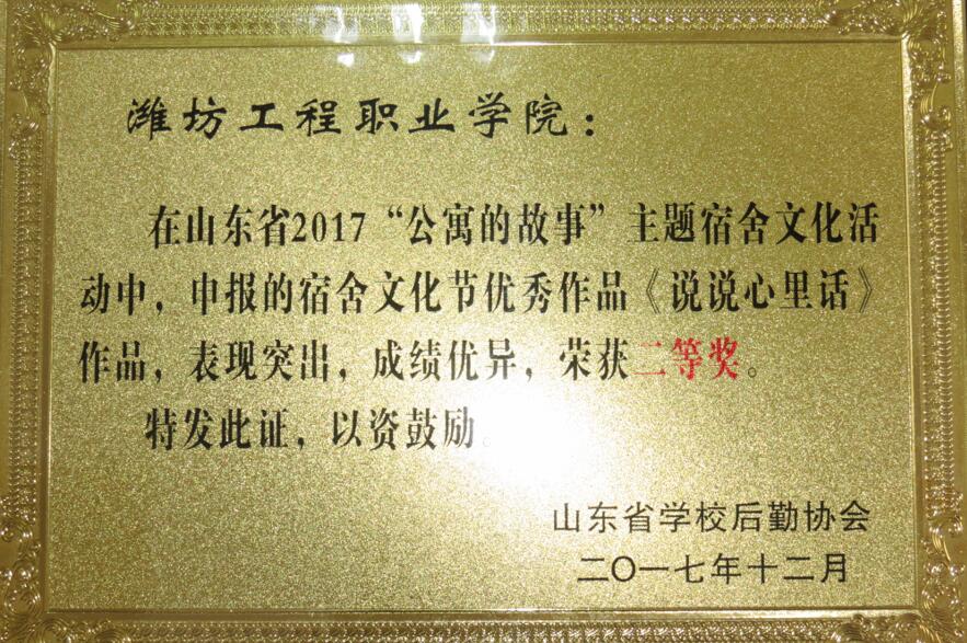 12月中下旬,山东省学校后勤协会高校公寓管理分会一届二次全体会员大会暨 2017“公寓的故事”优秀作品现场展演会在济南召开。我院在全省“公寓的故事”系列教育活动中被授予“优秀组织奖”,经济管理系推选的节目《说说心里话》荣获二等奖。