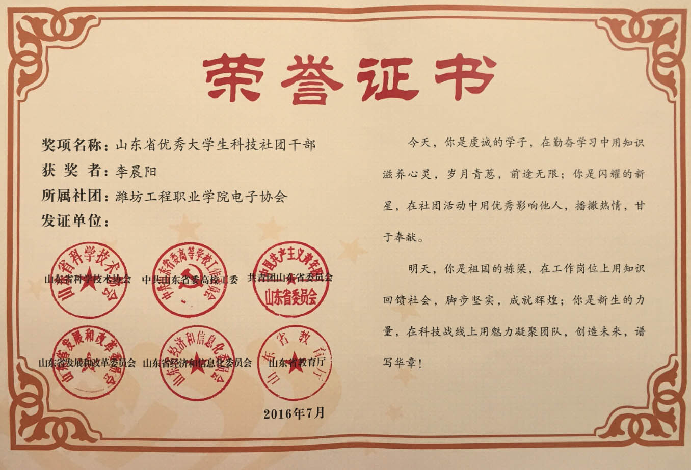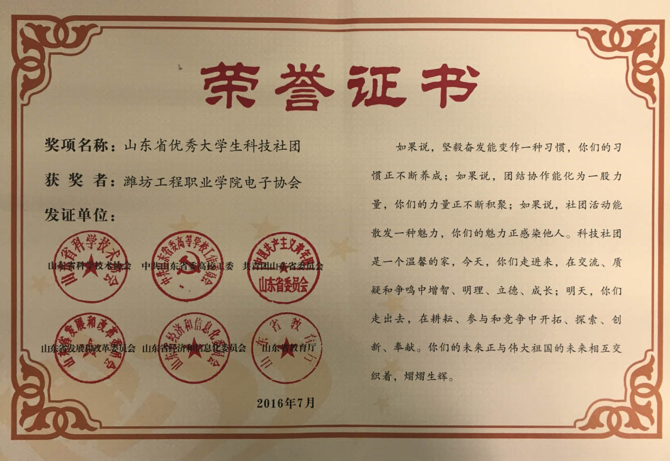 由山东省科协、团省委、省教育厅、省高工委等部门共同开展的2016年山东省大学生科技节优秀科技社团和优秀科技社团干部评选活动结果近日揭晓。经选拔、推荐和评审,我院山工机电工程学院的“电子协会”获“2016年度山东省优秀大学生科技社团”称号,电子协会负责人李晨阳同学获“2016年度山东省优秀大学生科技社团干部”称号。