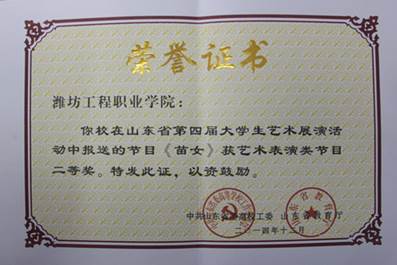 日前,由中共山东省委高校工委、省教育厅主办的第四届山东省大学生艺术展演活动圆满落幕。我院报送的由学前教育专业学生表演的舞蹈《苗女》、《且吟春雨》分别获得了二等奖和三等奖。王凯、李静老师获本次活动指导教师奖。