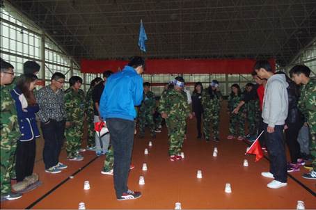 本次素质拓展训练共设置了“五十米绑腿跑”、“五毛一块”、“雷区取水”、“地雷阵”、“智力扑克”五个项目。活动前,负责人将不同机构的学生干部重新组合成了三个小组,队员们各尽其能,团结互助,全身心地投入到训练中,严格要求自已,勇于挑战自我,经受住了心理、体能的挑战。活动过程中队员们密切配合、团结一致,尤其是“雷区取水”在紧张的气氛中让同学们感受到了信任与合作的力量。