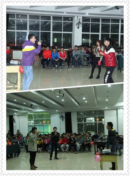 活动在王倩、郑菲两位同学的甜美歌声中拉开帷幕。比赛共分为三轮,赛后进入互动环节,如“抢踩好运”、“盲人摸象”、“你抢我夺”。各位选手之间的默契配合及“笑料”百出更是把比赛一次次推入高潮。选手们的出色表现赢得现场同学们的热烈掌声。最终,工程班的陈衍甫、李唯聪同学夺得冠军宝座。