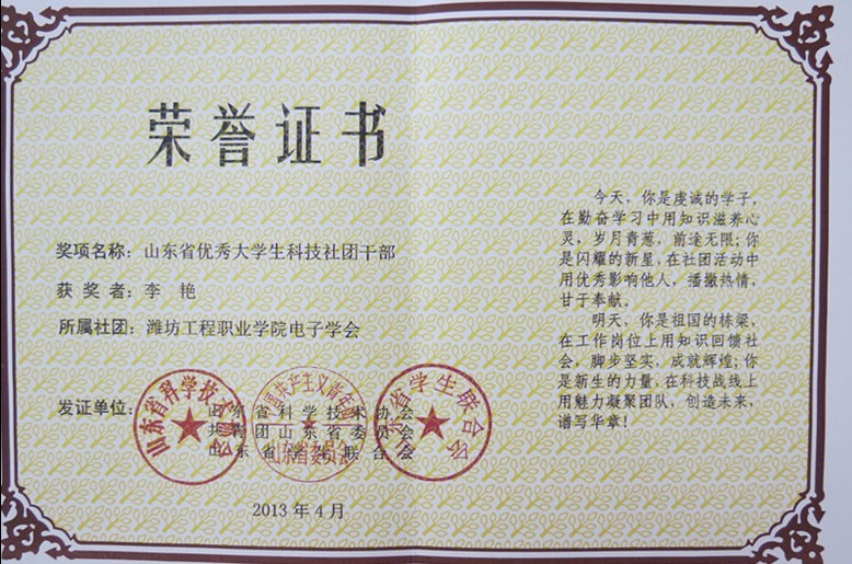 近日,山东省科技协会、共青团山东省委员会、山东省学生联合会、山东省科学技术协会共同开展了2013年山东省优秀大学生科技社团和山东省优秀大学生科技社团干部评选活动,评选出山东省大学生优秀科技社团77个,山东省大学生优秀科技社团干部78名。我院大学生电子学会获“山东省优秀大学生科技社团”,山工机电工程学院李艳同学被评为“山东省优秀大学生科技社团干部”。