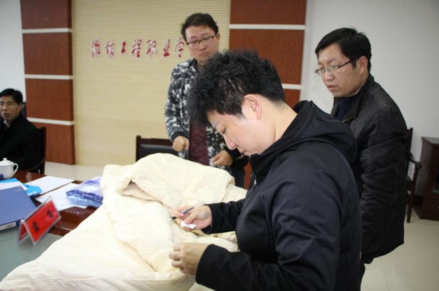 汇报会上,韩振华对专家组莅临我院指导工作表示欢迎和感谢,并向专家组介绍了我院学生公寓床上用品质量管理情况。团委学生处负责同志从积极参加省高校学生公寓床上用品集中采购会议、建立健全学生公寓床上用品集中采购工作长效机制、完善公寓床上用品招标程序、加强监督管理,各部门分工明确、规范校园内部管理,学生自带自购床上用品数量及来源的登记工作等方面进行了详细汇报。随后,专家组查阅了学院公寓床上用品质量管理的相关档案材料,实地查看了学生公寓床上用品质量情况并抽取样品进行查验。