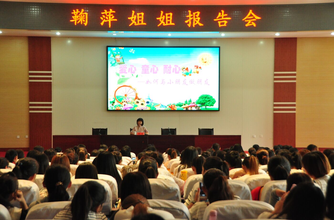 随后,鞠萍姐姐一行来到南校区,在操场上与同学们亲切合影留念后,她来到学术报告厅,为2014级同学作了一场题为“爱心、童心、耐心——如何与小朋友做朋友”的精彩报告。在报告中,鞠萍姐姐结合自己的学习和工作经历,围绕“爱心、童心、耐心——如何与小朋友做朋友”这一主题,语重心长,娓娓道来,给同学们以深刻的启发与教导。她指出,作为幼儿教师应该有职业规范,包括着装规范、言行规范等;在与幼儿交往的过程中应该尊重孩子,这种尊重不但应该体现在言语中,更应该体现在行为中。幼儿教师应该热爱孩子,用最大的耐心去倾听、理解孩子,把儿童真正的当做一名儿童去对待。最后,鞠萍姐姐对广大同学提出了殷切希望,希望他们利用一切可能的机会去充实自己,增长知识,提高素质,利用自已所学到的知识和技能来促进孩子们的成长,让他们有一个幸福、快乐的童年。报告结束后,鞠萍姐姐亲切地和在座的同学进行了互动交流,耐心地解答了同学们提出的问题并分享了自己教育孩子的心得,强调在教育孩子的过程中一定要懂得放手,不要事事包办,只有这样,孩子才能真正长大。