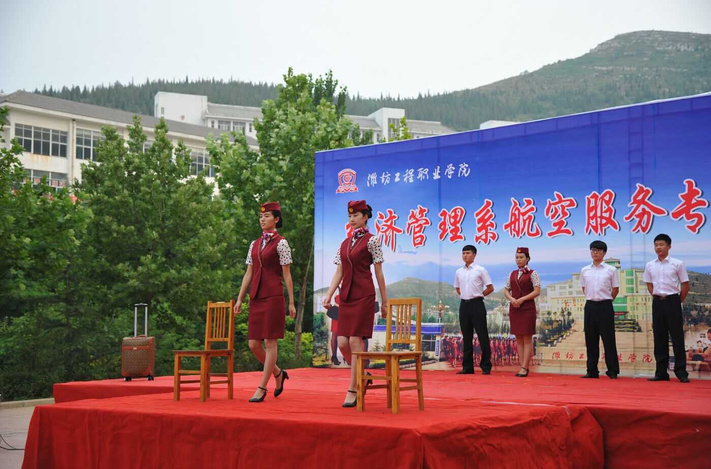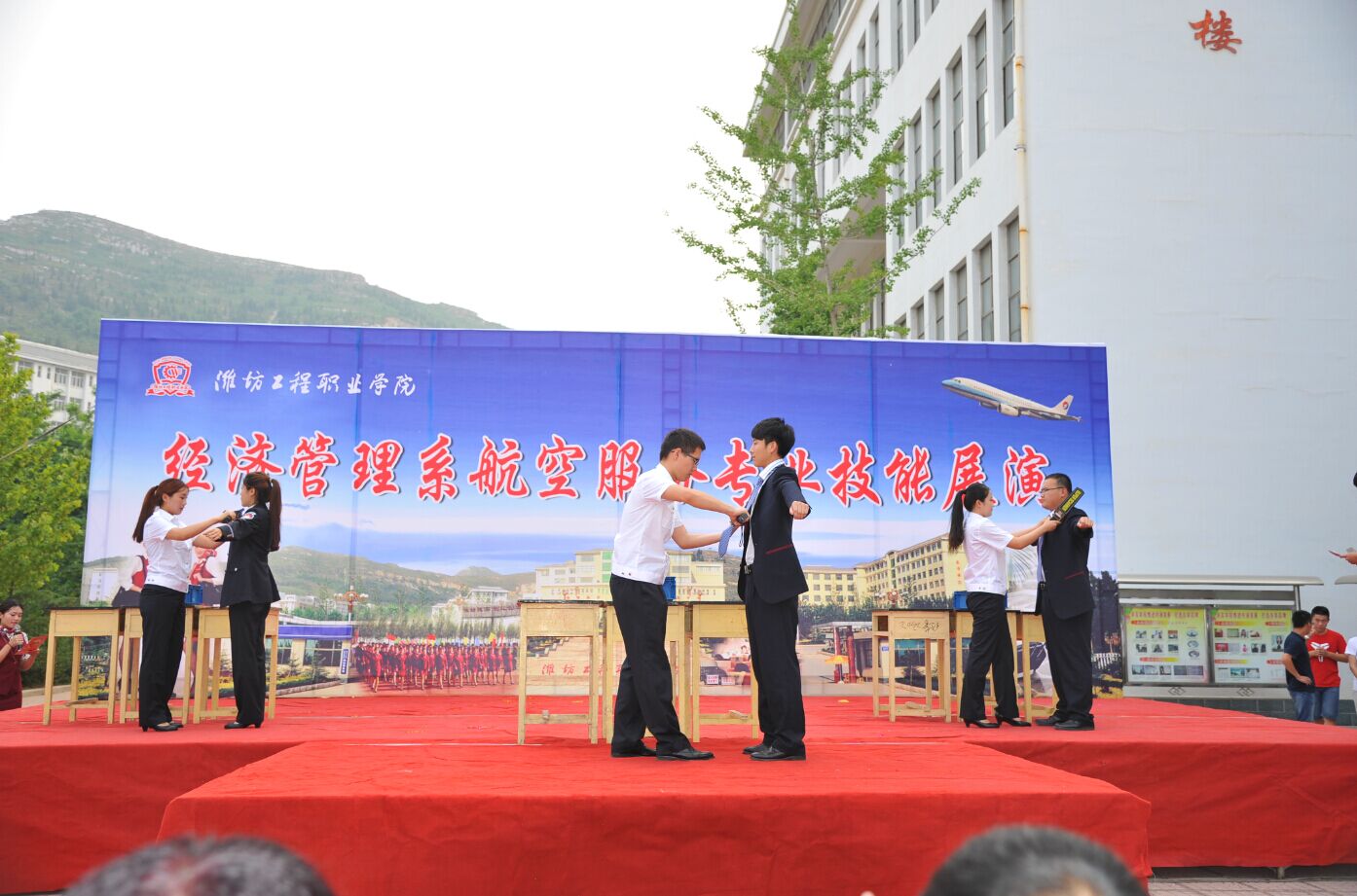 为展示航空服务专业的办学成果,检验学生专业技能水平,完善航空服务专业建设,培养学生团队协作、拼搏进取的精神,经济管理系于6月17日在1号教学楼前举办了首届航空服务技能展演。院领导韩振华出席活动。团委学生处、教务处负责同志,经管系全体教师及2014级航空服务班全体同学参加了本次展演活动。